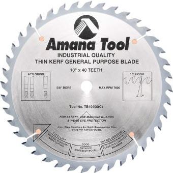 Amana Tool TB10400 Carbide Tipped Thin Kerf General Purpose 10 Inch D x 40T ATB, 15 Deg, 5/8 Bore, Circular Saw Blade