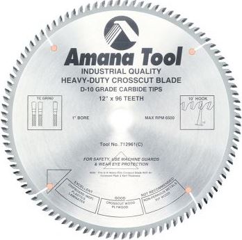 Amana Tool 712961 Carbide Tipped Cut-Off and Crosscut 12 Inch D x 96T TCG, 10 Deg, 1 Inch Bore, Circular Saw Blade