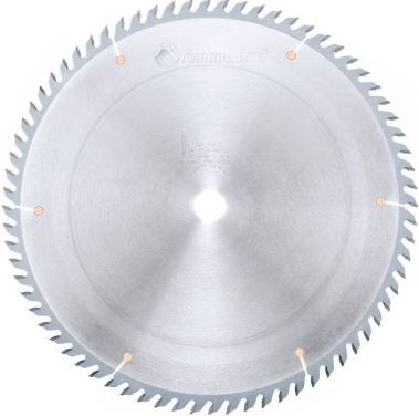 Heavy-duty production blade featuring increased thickness of plate and kerf and more aggressive hook angle. For plastic laminated materials, composition board and plywood.
