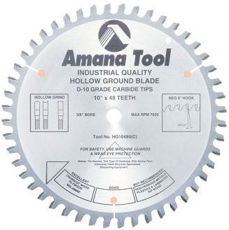 Amana Tool HG10480 Carbide Tipped Hollow Ground 10 Inch D x 48T HG, -6 Deg, 5/8 Bore, Circular Saw Blade