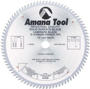 Amana Tool 612841 Carbide Tipped Solid Surface 12 Inch D x 84T M-TCG, 0 Deg, 1 Inch Bore, Circular Saw Blade