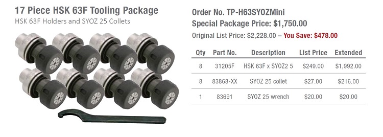 17 Piece HSK 63F Tooling Package HSK 63F Holders and SYOZ 25 Collets Order No. TP-H63SYOZMini
