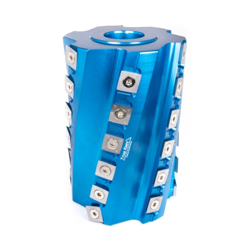 Titan Spiral insert knife cutterheads make constant contact with the surface of the material in a helical pattern offering reduced cutting noise - typically 20 decibels less. Each long wearing carbide knife has four edges that can be dulled before replacement. These moulder cutter heads improve material finishes on wood cross grain, lower long term tooling cost, and eliminate sharpening costs. Our molder spiral heads offer special radius edge inserts set at a shear angle to reduce any chance of knife corners marking your material. Spiral Heads are made from 7071-T6 high strength aircraft aluminum and are hard anodized making the cutterhead strong and light. They are dynamically balanced to 8,000 rpm. Heads include a set of carbide knives installed and ready to run. Heads also include a torx wrench for turning and replacing the knives. Titan Spiral Heads use 15 x 15 x 2.5 - 8 radius insert knives.